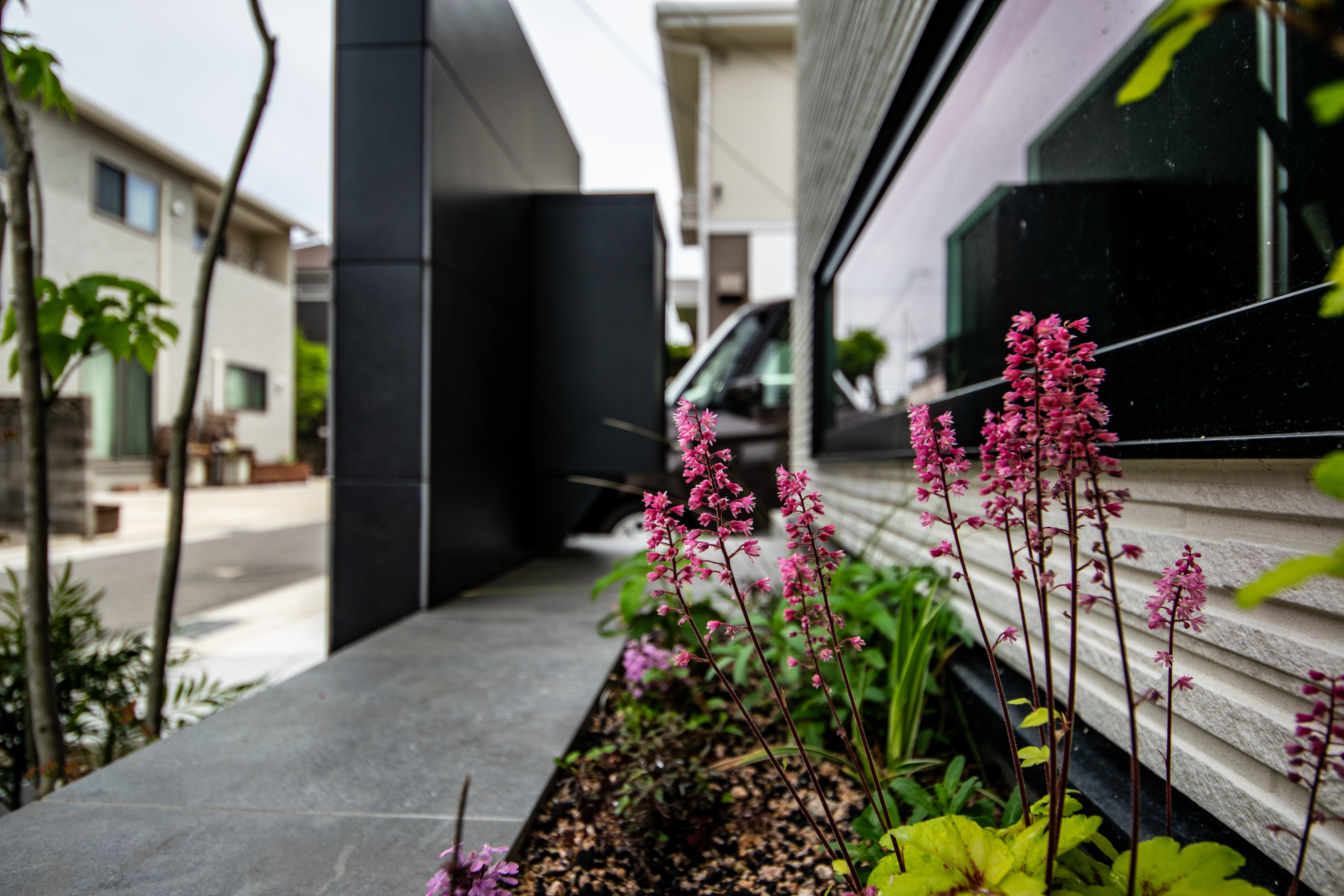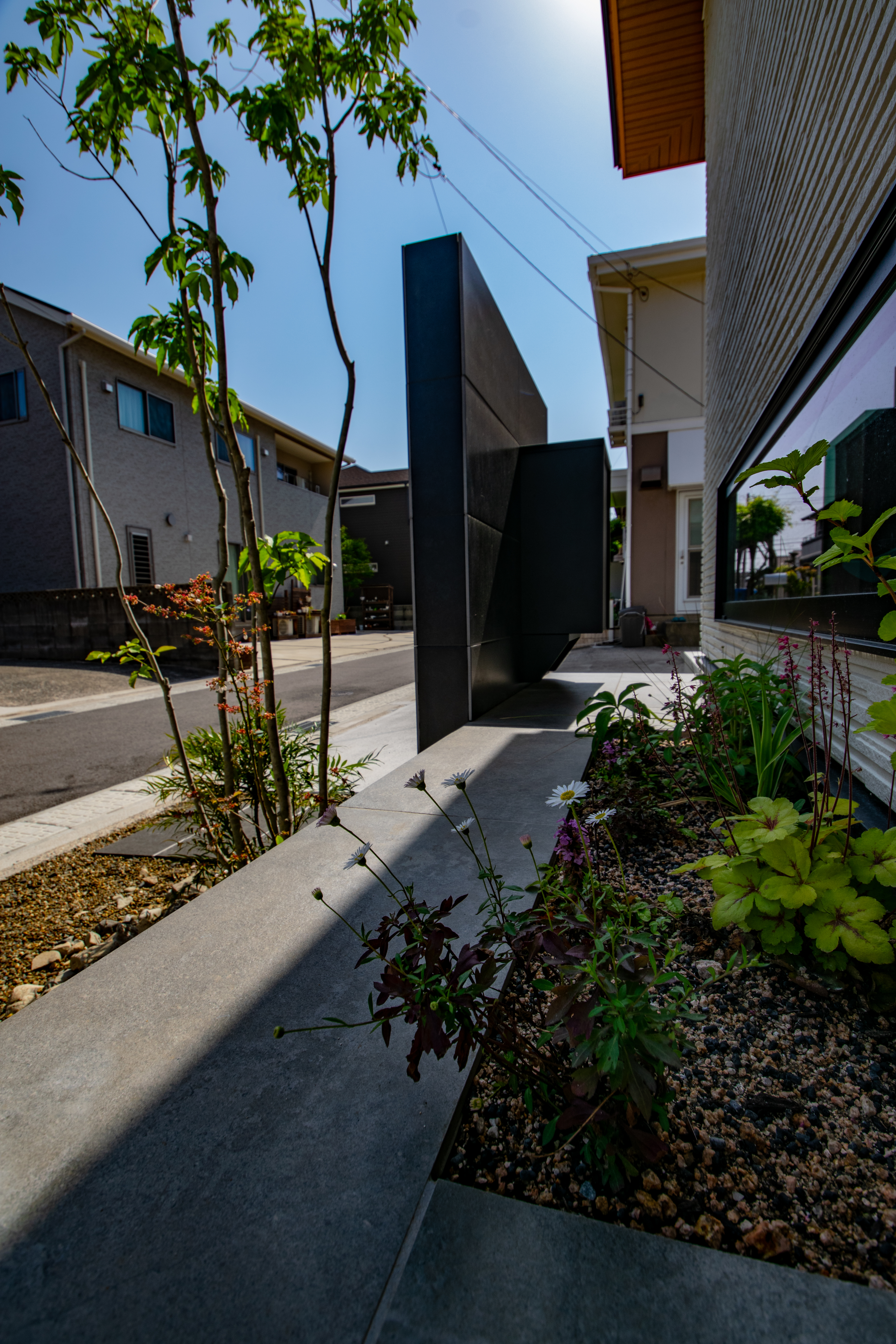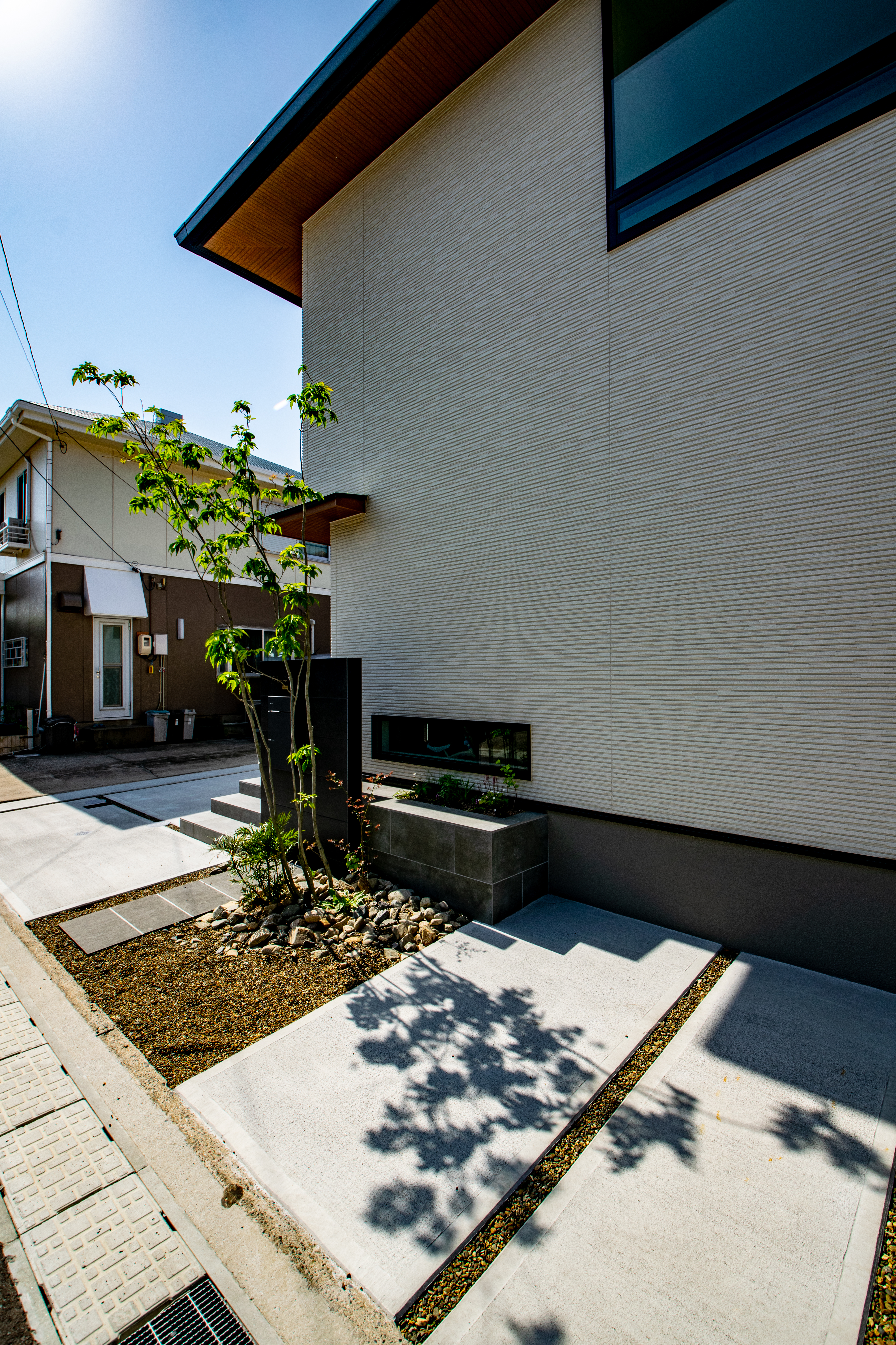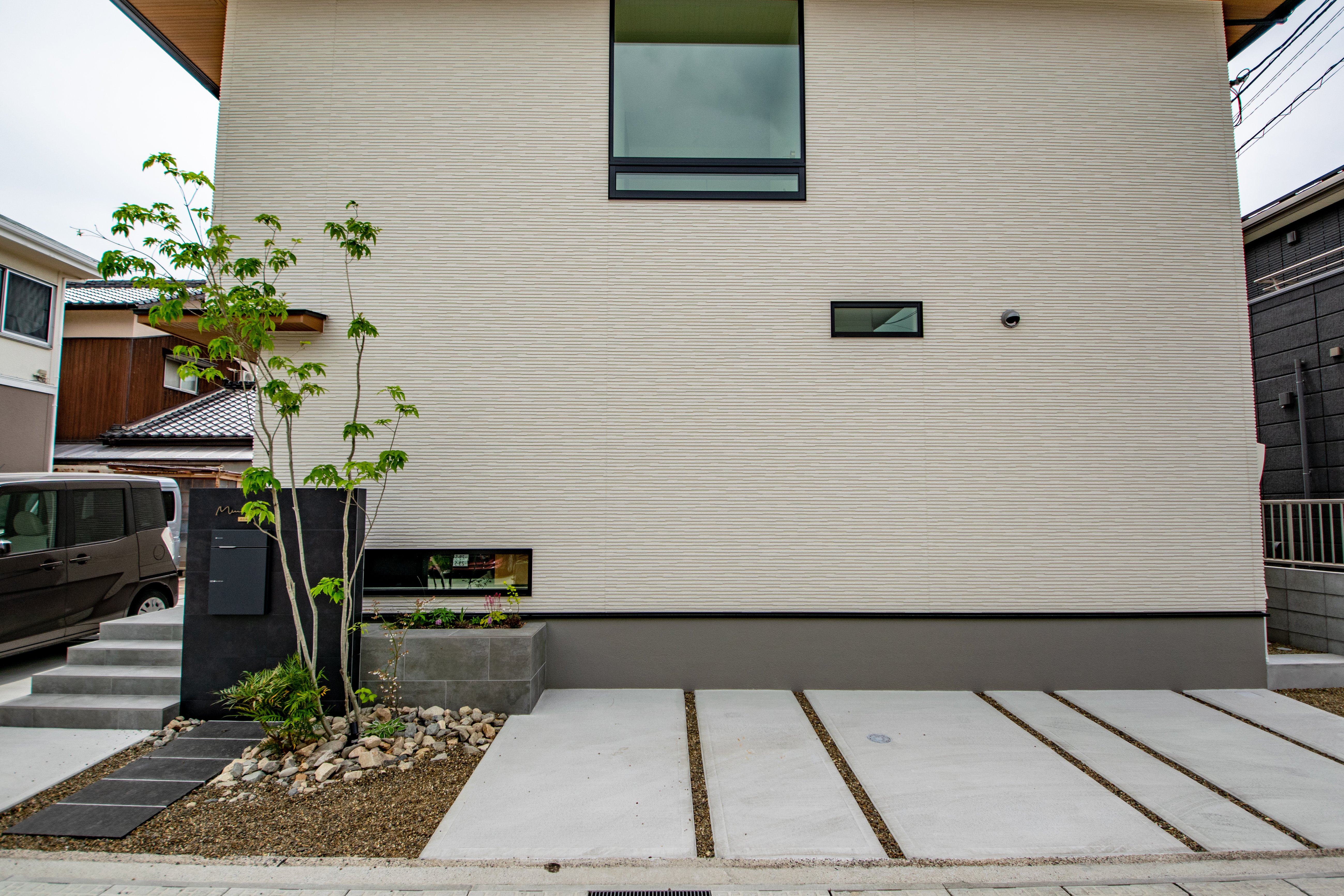 下関市にて住友林業さんの新築外構工事です。建物とマッチしたシンプルなファサードとしました。玄関ポーチから外構範囲とし地窓から見える花壇と一体になるデザインです。