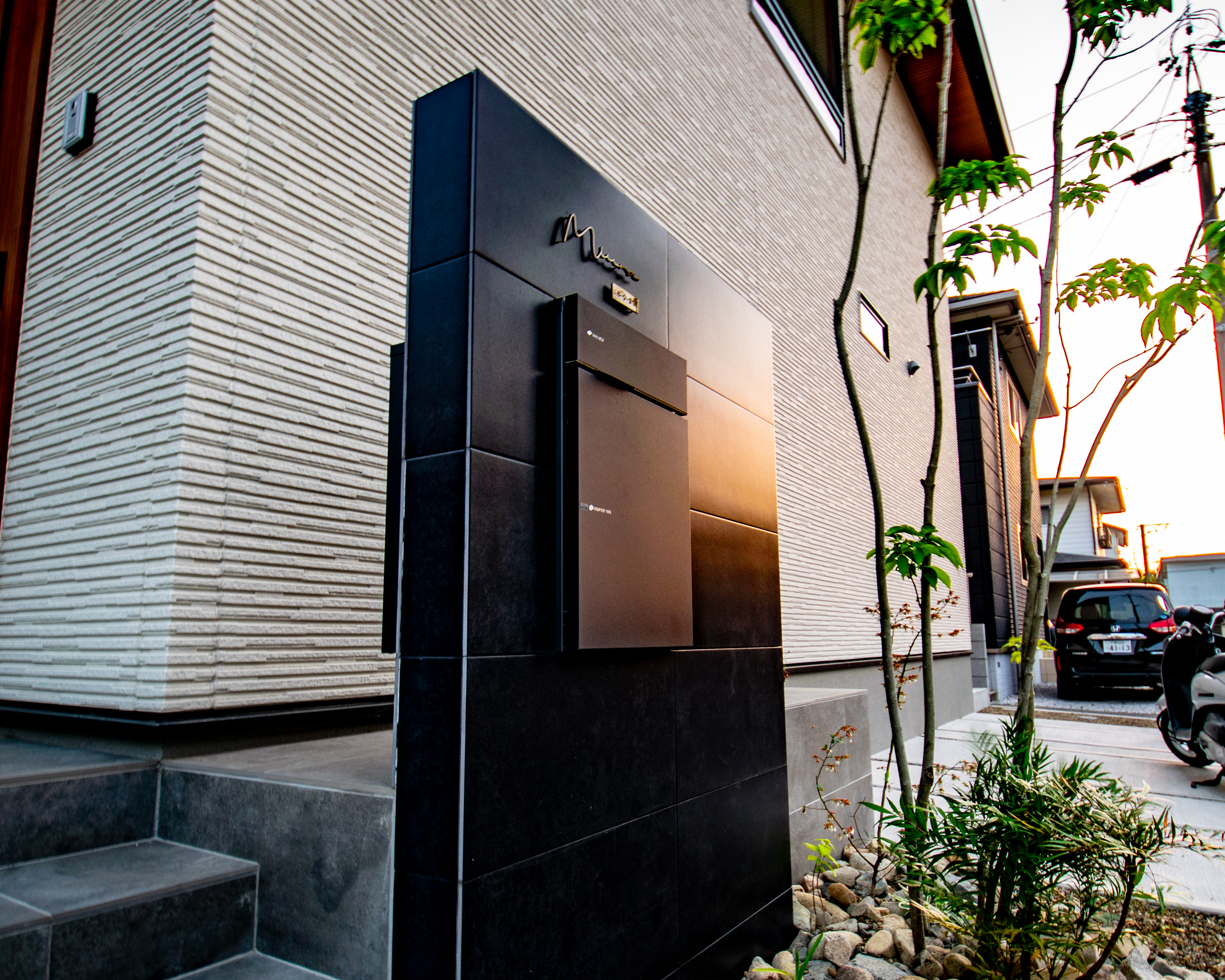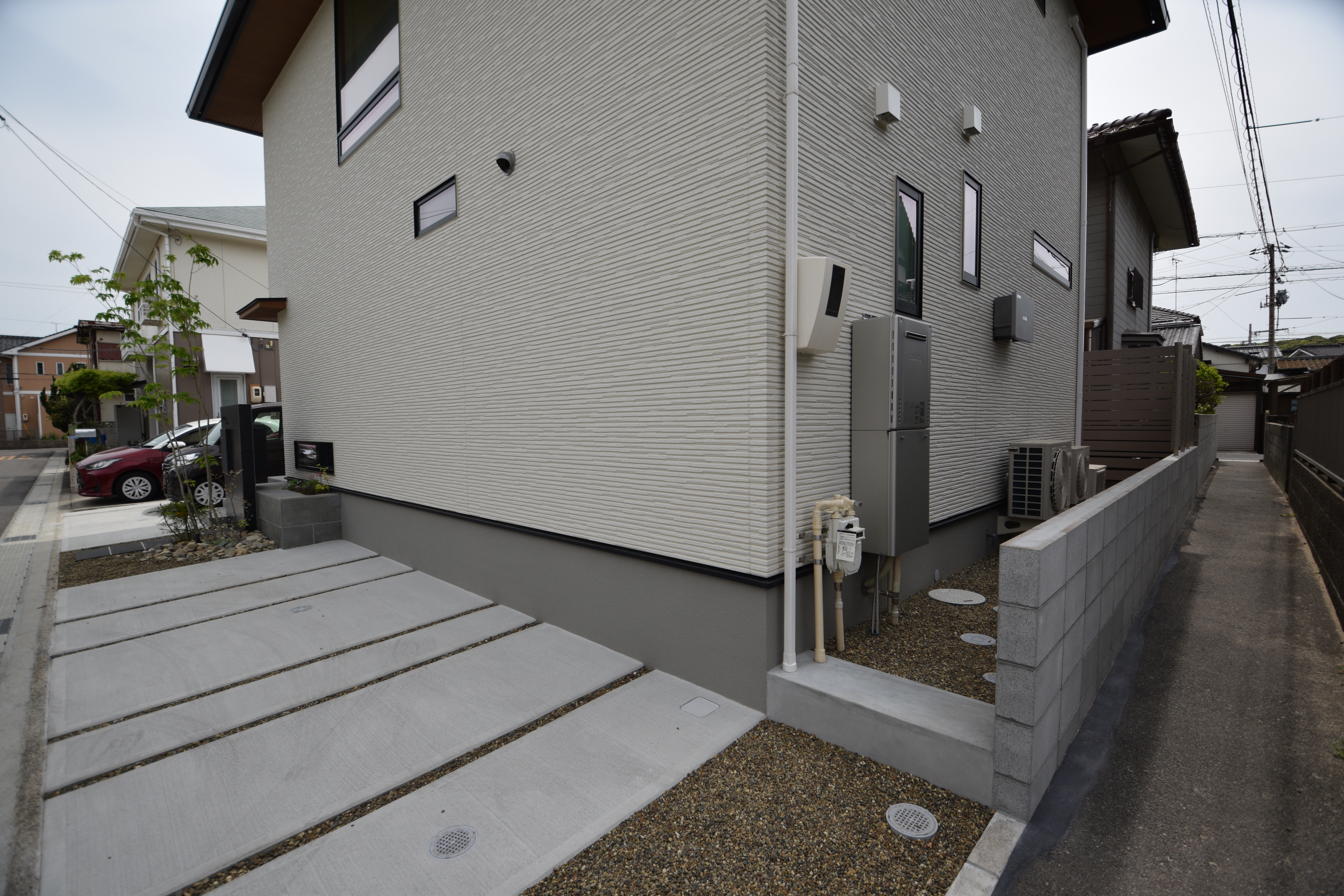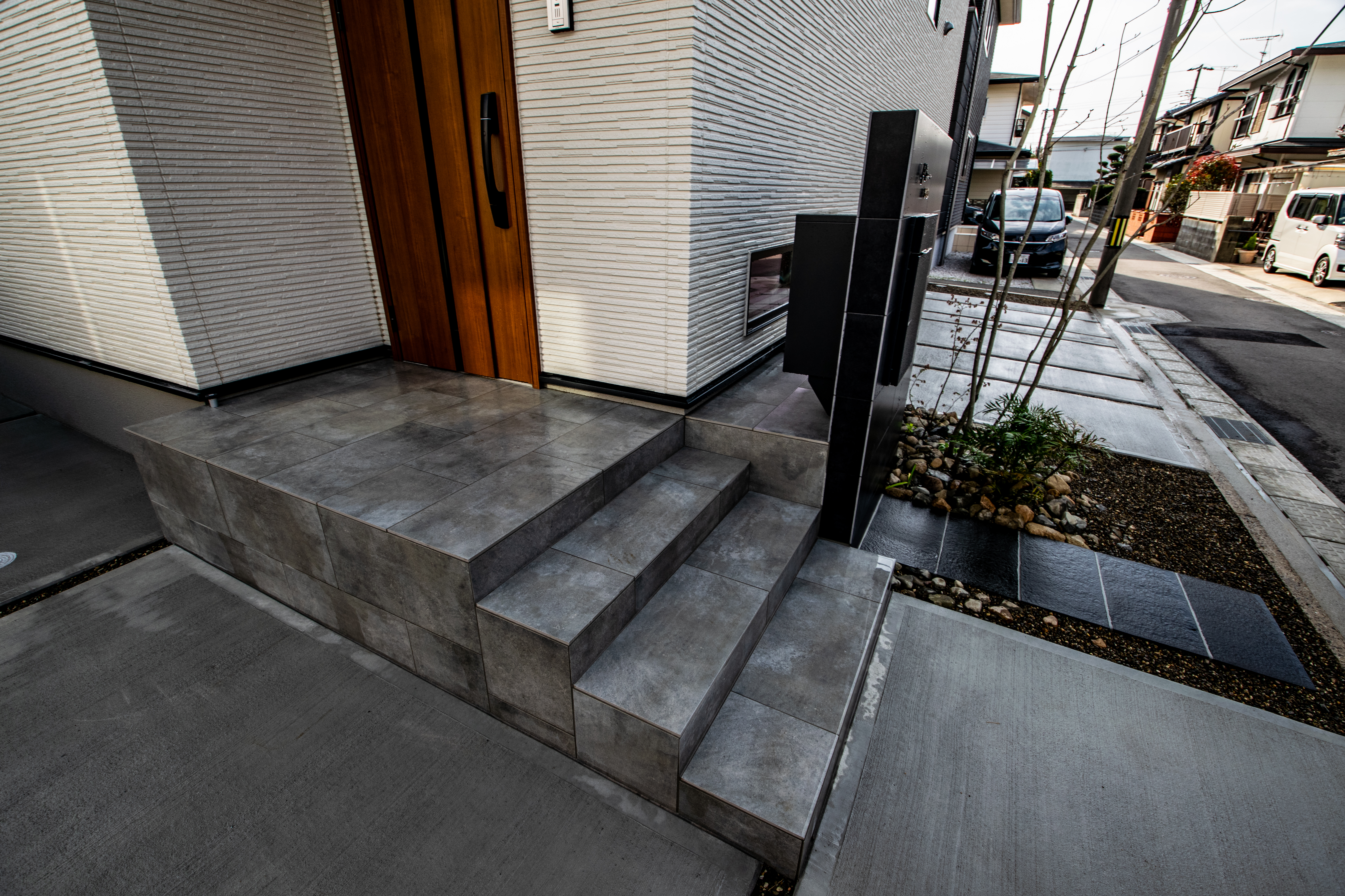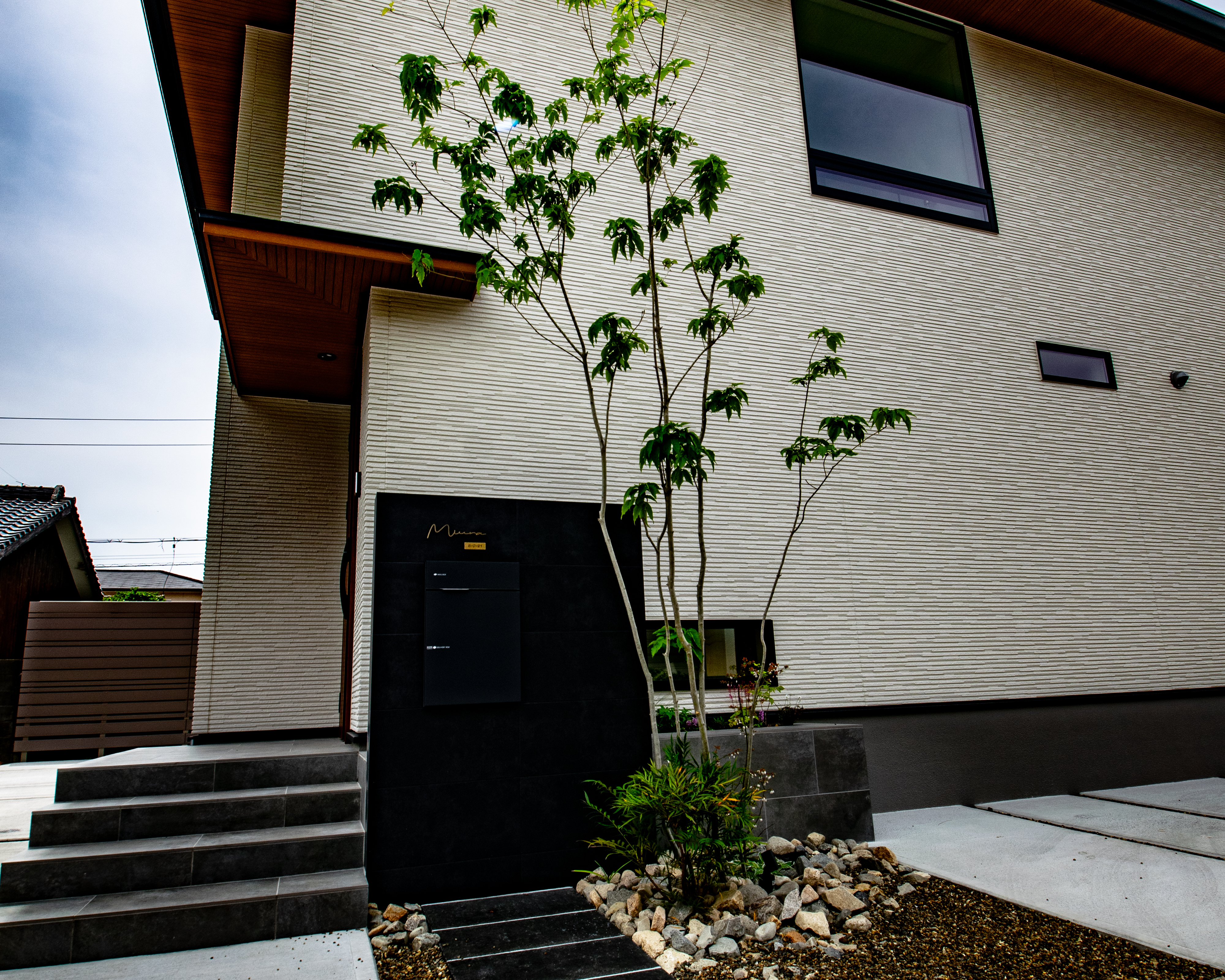 下関市にて住友林業さんの新築外構工事です。建物とマッチしたシンプルなファサードとしました。玄関ポーチから外構範囲とし地窓から見える花壇と一体になるデザインです。
