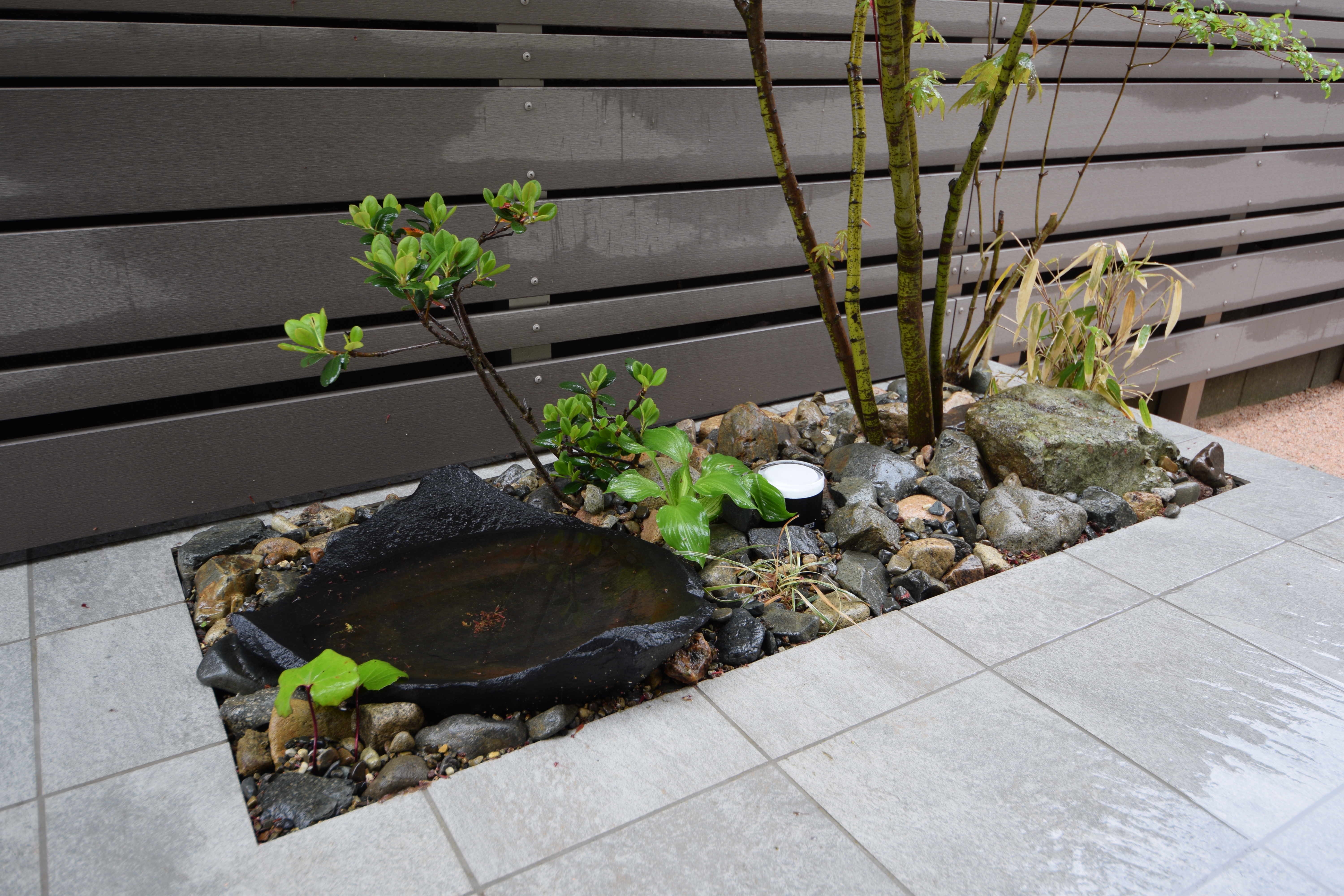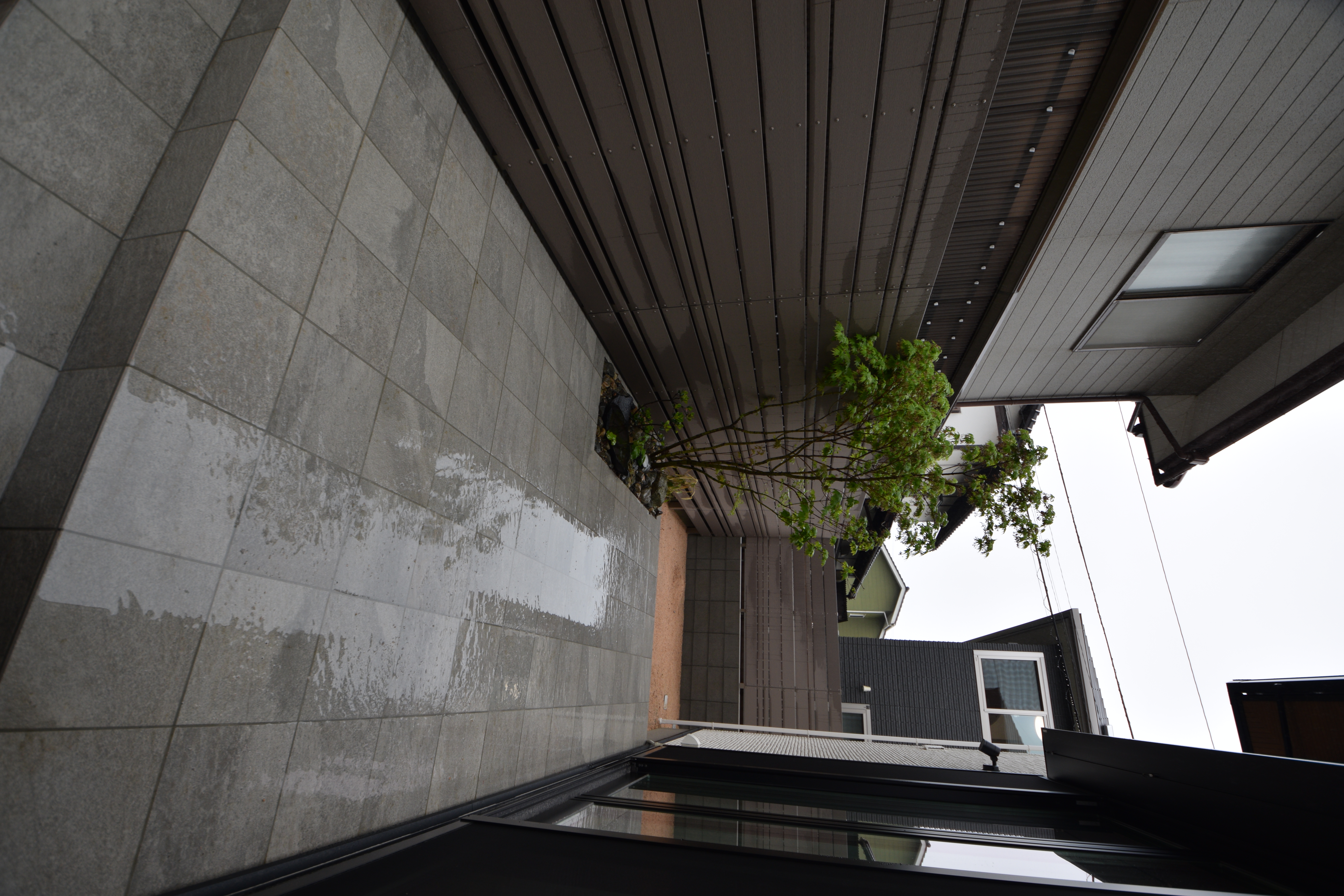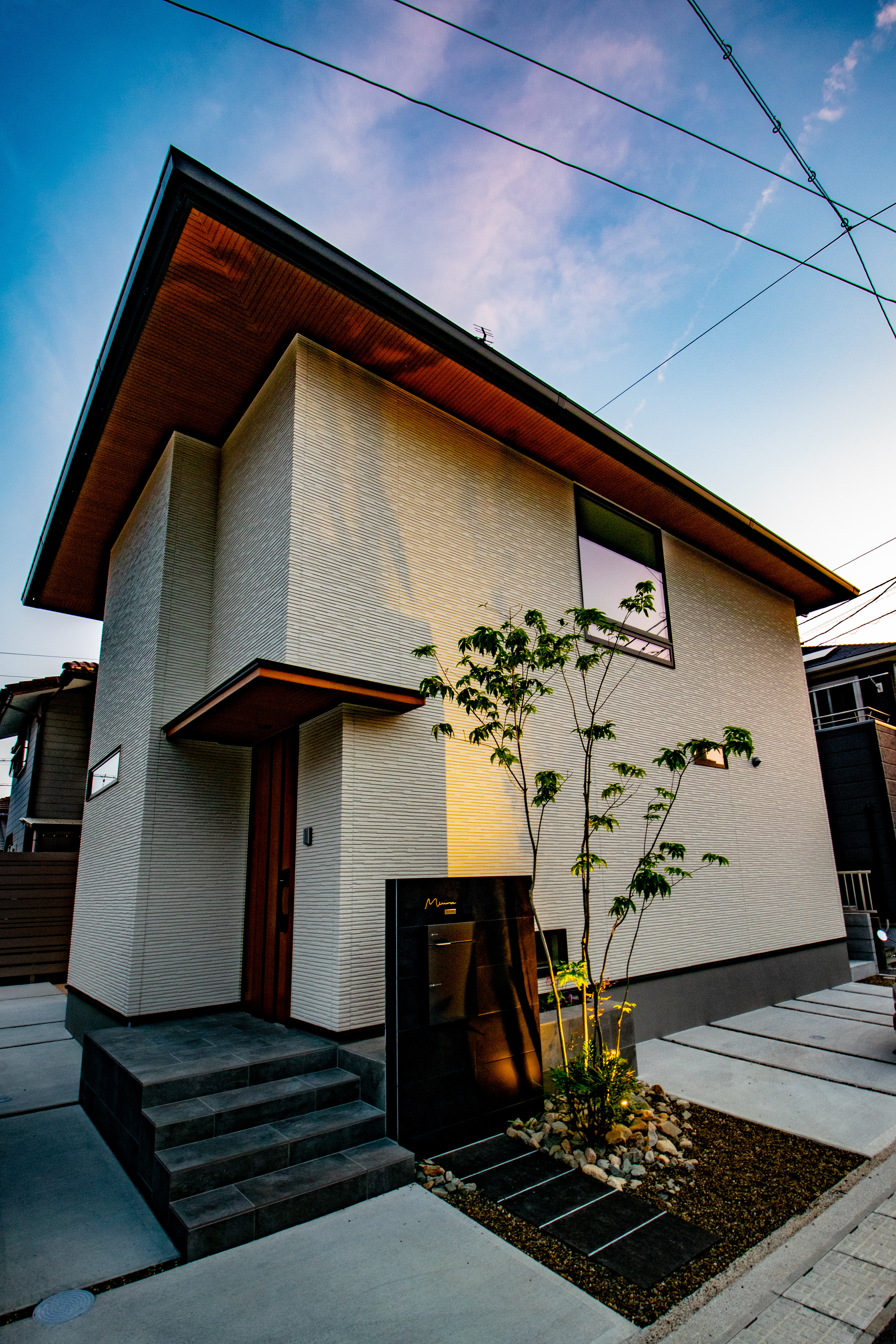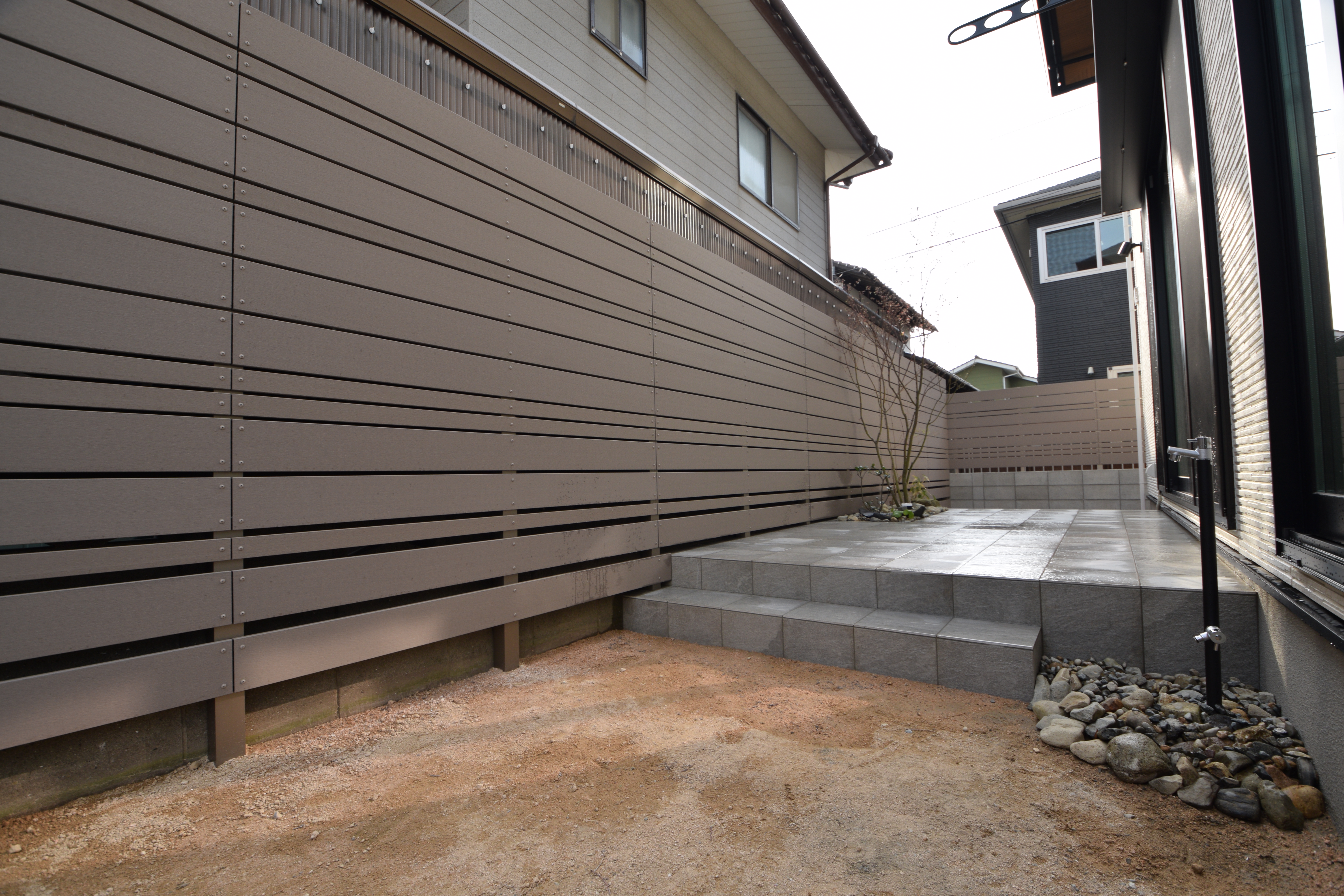 下関市にて住友林業さんの新築外構工事です。建物とマッチしたシンプルなファサードとしました。玄関ポーチから外構範囲とし地窓から見える花壇と一体になるデザインです。