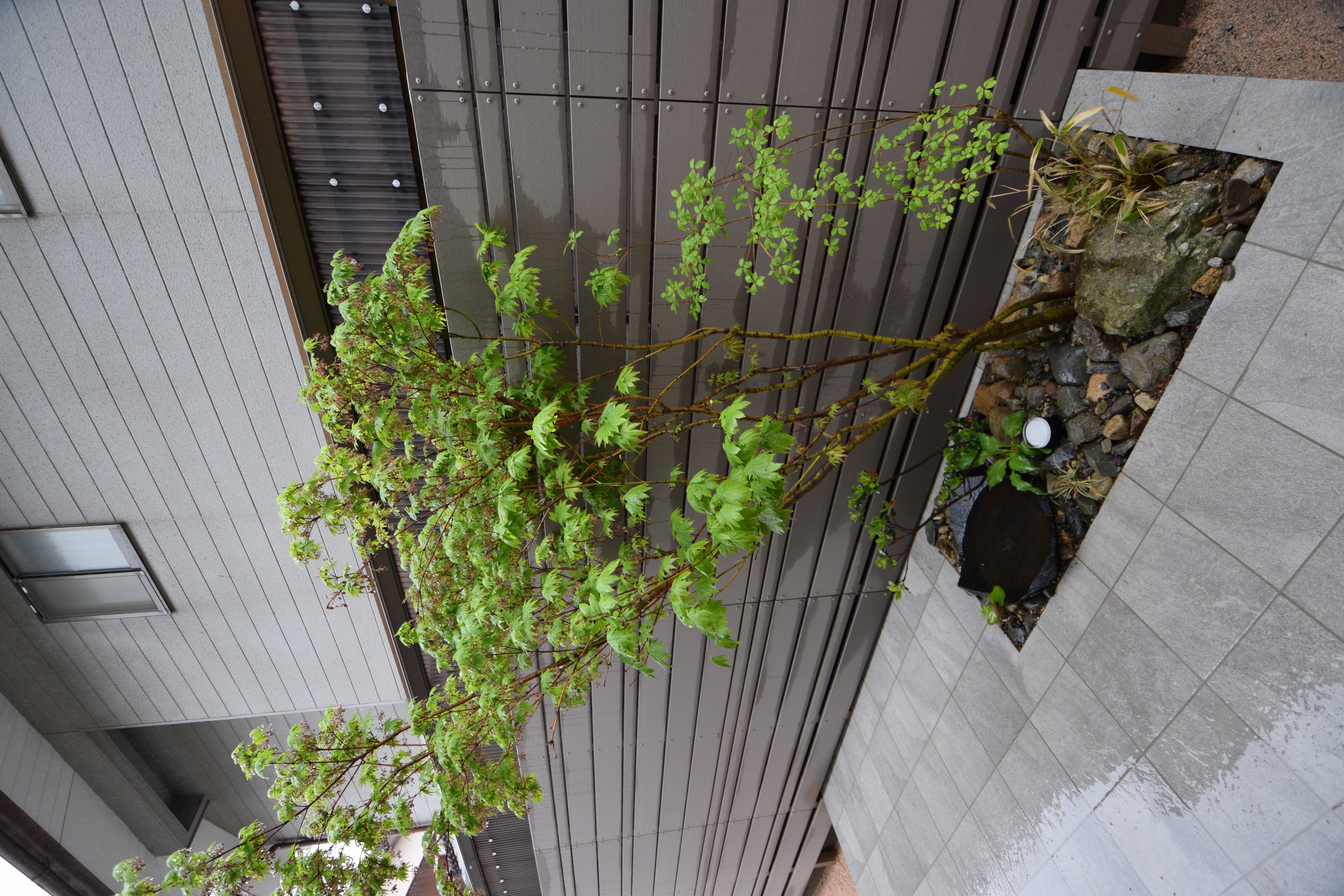 庭をリビング延長と捉えタイルテラスを境界まで造り広く使えるスペースとした。窓の正面には癒しのみどりを配植してます。